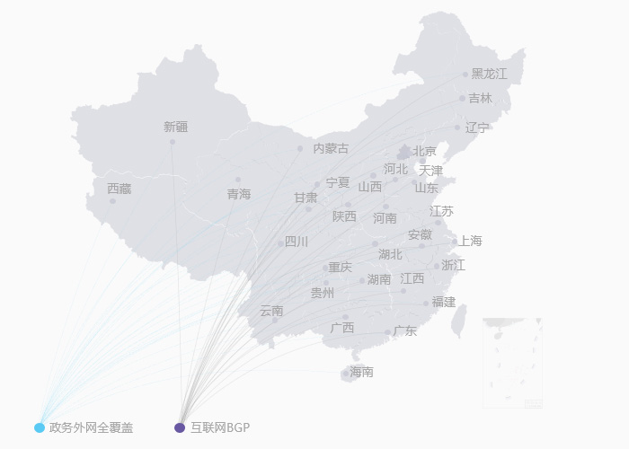 政务外网网络覆盖:连接31个省份和新疆生产建设兵团,地市级和区县级政务外网覆盖率均达到100%;节点范围全国覆盖,直连中央骨干网。